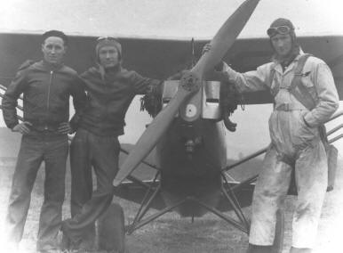 From left to right: Joe Brown, Dick Joyce, and Chuckles Keiling in front of the Heath Parasol.