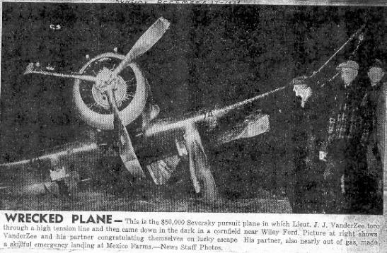 The photo and newspaper clipping of the P-35 following the crash at Mexico Farms.