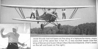In 1991, while at Sun-N-Fun Fly-In in Lakeland, Florida, Jessie, at age 82, again took to the air as a wing walker on a 1930 model 225hp Wright Whirlwind powered New Standard D-25 bi-plane owned and flown by Steve Oliver. Suzanne Oliver, Steve’s wife, stood on the opposite wing in order to balance the plane. Both Jessie and Suzanne remained between the wings while Steve Oliver flew the airplane over the huge crowd during the Sun-N-Fun Fly-In. Jessie had not been on the wing of a bi-plane for many years and this act was an impressive feat, especially considering her advanced age.