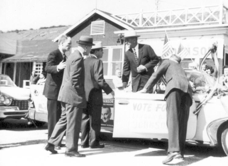President Lyndon B. Johnson boarding an automobile in front of the original airfield administration building after arrival at the Cumberland Airport.