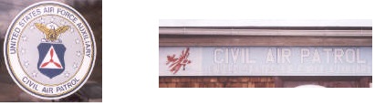 The Civil Air Patrol emblem on the left as it appears on the doorway of the CAP building, and the CAP signage at the same site on the Cumberland Airport.