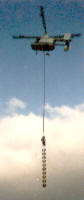 Note the long boom from the helicopter and the motor at the end of the circular saws. The flying power saw rig airborne and inbound for work.