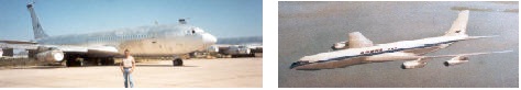 On the left is Tim Long in front of the Boeing 707 at Tucson, AZ that was previously flown by the Tim and Joe Long. On the right is an aerial shot of a Boeing 707.
