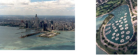 The Chicago skyline, photographed from over Lake Michigan, and on the right, a picturesque view of a marina along the coast line, with the boats in a floral arrangement.