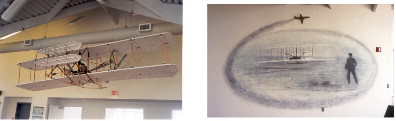 View of 1903 Wright Flyer in Gallery. Mural of Wright Brother’s first flight.