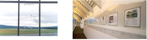 View from Gallery looking southeast over tarmac and runway. A portion of the Gallery and time line.
