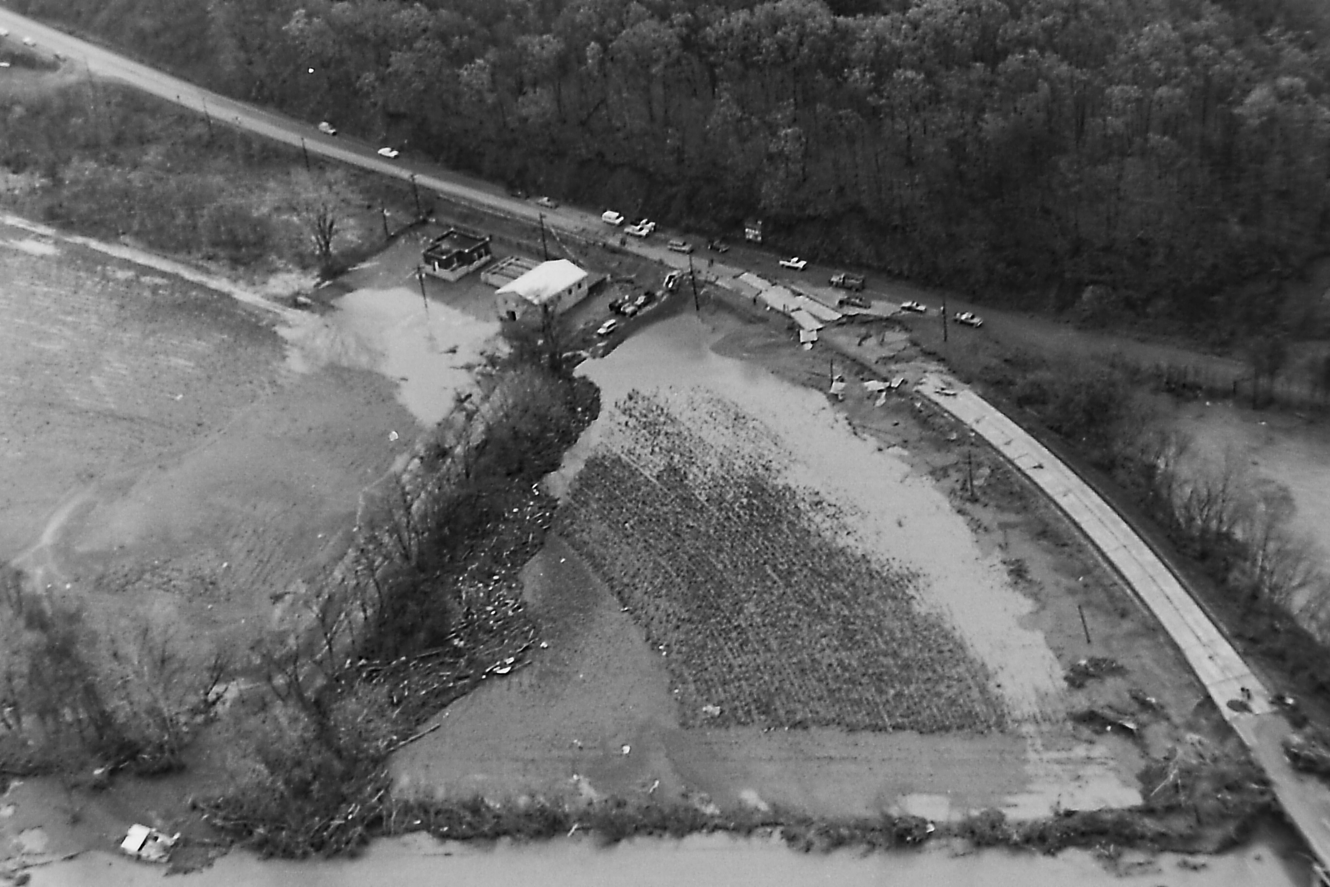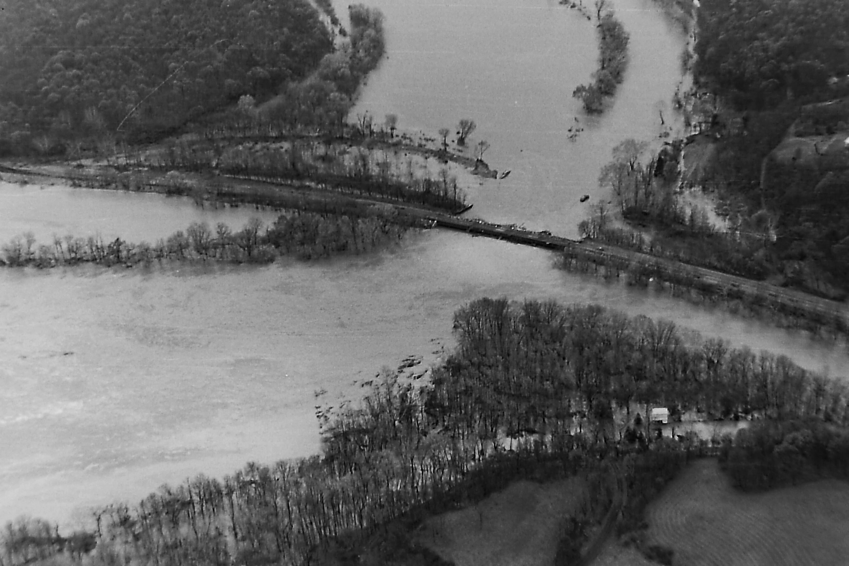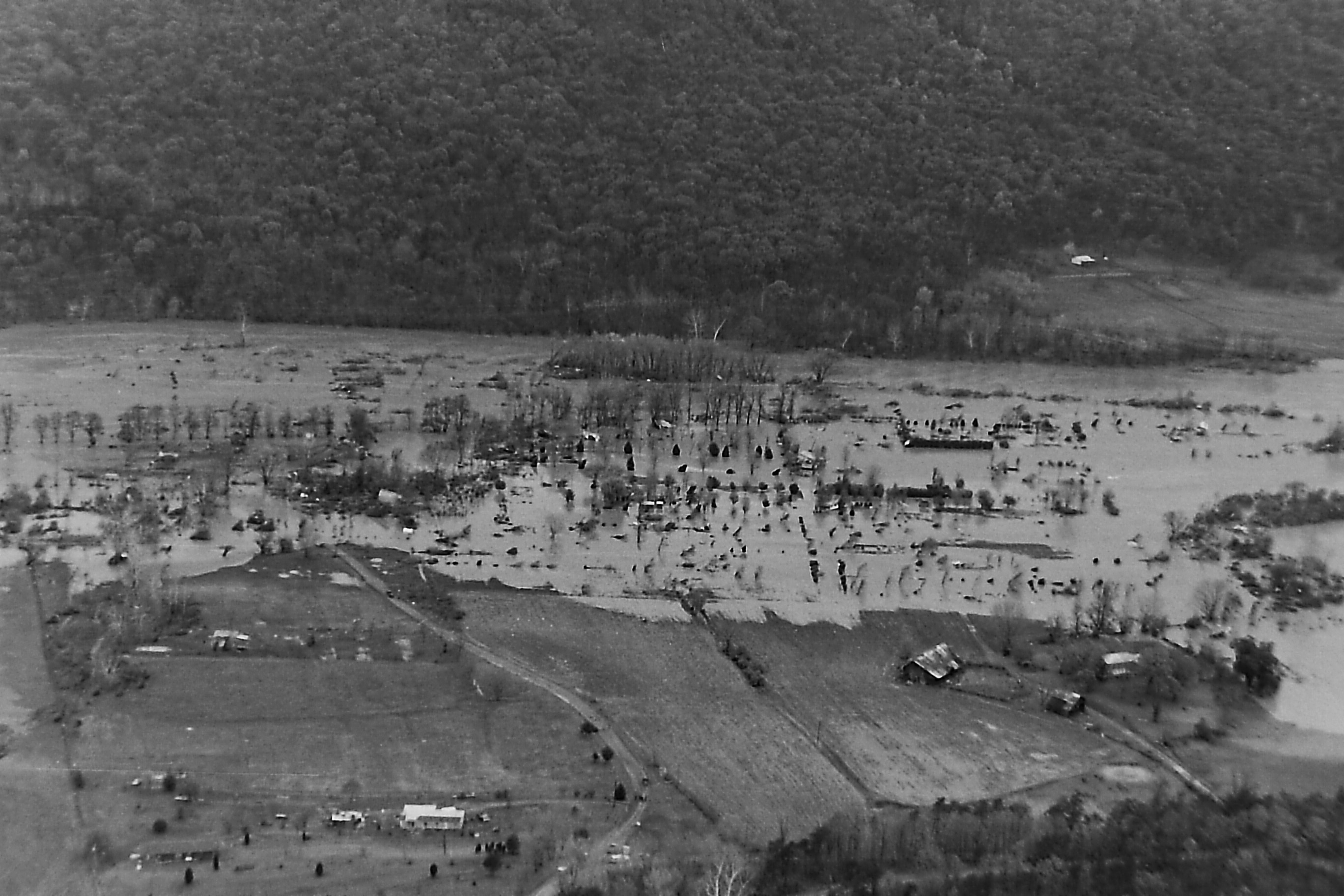The photographs below were taken in early November 1985, shortly after what later became known as the “Election Day Flood.” Following nearly a week of rain, among the hardest hit areas were those along the South Branch of the Potomac River. These photographs show some of that flooding, between the West Virginia towns of Springfield and Romney.